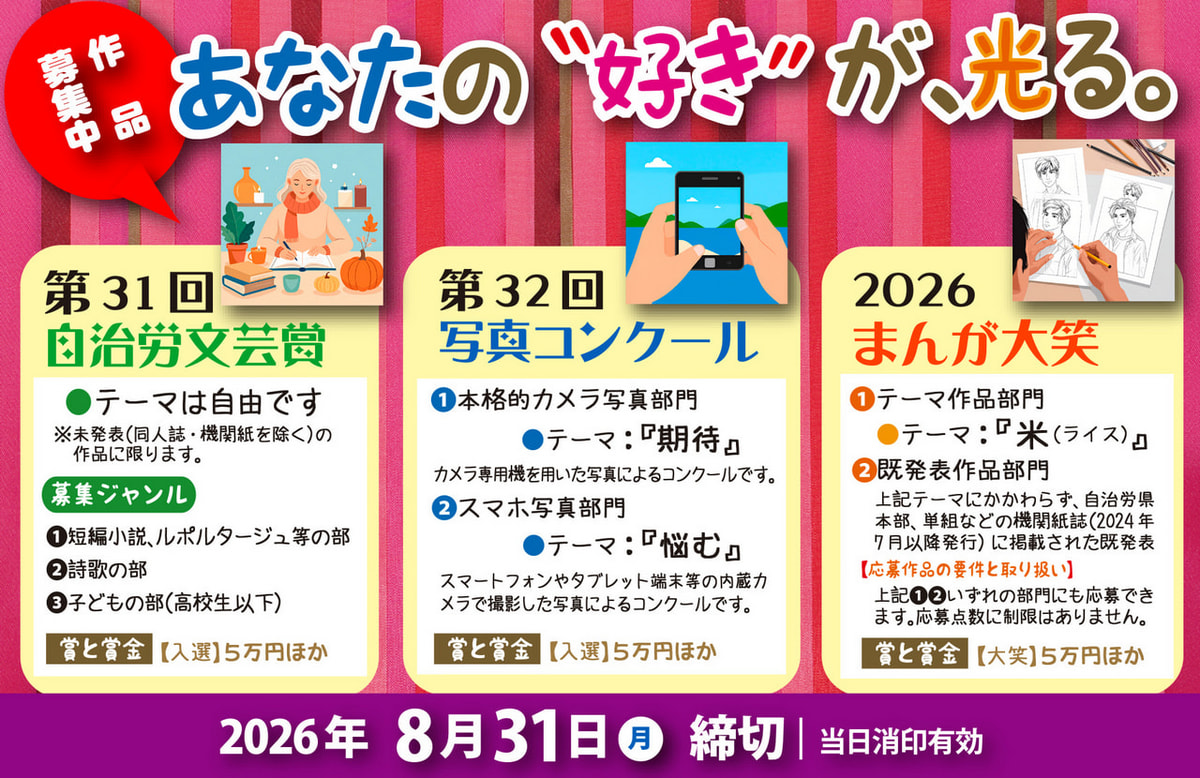 ②既発表作品部門:上記テーマにかかわらず、自治労県本部、単組などの機関紙誌(2024年7月以降発行)に掲載された既発表作を対象とします