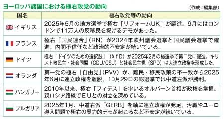 自国第一主義を唱え、自由と人権、民主主義や国際協調といったリベラルな価値観を否定し、特定の国家や民族、宗教などの特殊な価値観を絶対視する勢力が世界各地で台頭しています。ヨーロッパ諸国では中道リベラルの与党の地位を脅かしたり、与党の一角を占めている国もあります(下図参照)。アメリカのトランプ大統領も極右と言ってよいでしょう。