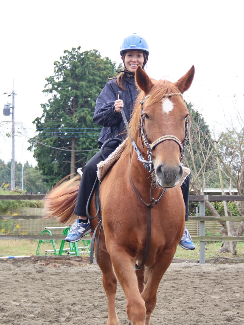 乗馬体験した自治労本部・八巻由美総合企画総務局長。乗せてくれたのは「むぎちゃん」。
