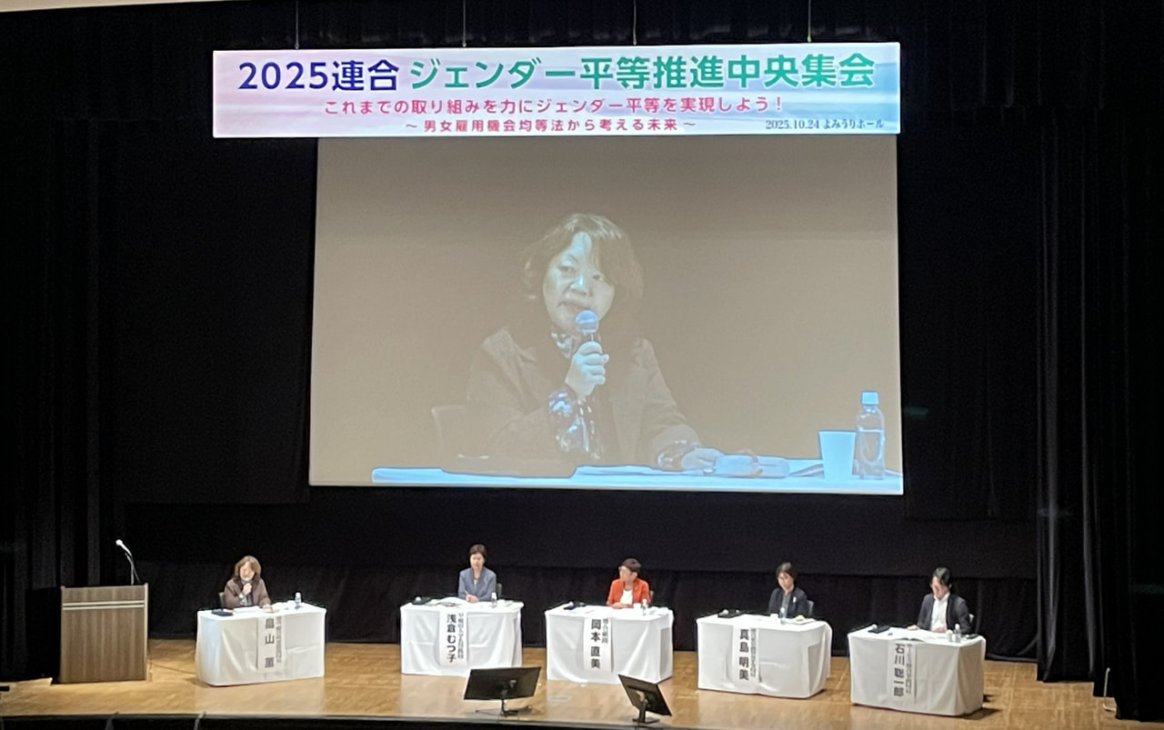 連合は10月24日、「2025ジェンダー平等推進中央集会」を東京・よみうりホールで開催。「これまでの取り組みを力にジェンダー平等を実現しよう!~男女雇用機会均等法から考える未来~」をメインテーマに、会場には714人(女性324人、男性389人、その他1人)が参加。自治労からは23県本部1社保労連から45人(女性36人、男性9人)が対面で、15県本部がWEBで参加した。