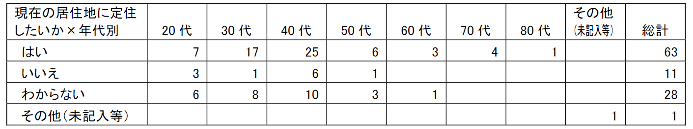 (3) 地縁団体から志縁団体へ 当市では、6年前から地域人材育成事業「協働のまちづくりアカデミー」を実施している。これは65歳未満の市民を対象に地域リーダーの養成をめざしているもので、イベントの企画や会議の進行方法などを学び、修了時には地域の振興会とコラボして事業を実施するなど、受講生が振興会と交流する機会を作っている。この事業には毎年20人程度の若者が参加していて、いずれも地域づくりに関心をもつ意欲ある若者である。 しかしながら、この講座を機会に振興会との交流が生まれ、講座修了後も一過性のイベントを企画提供する者として振興会との関係は続くことはあるが、振興会組織に所属するまでには至っていない。どちらかといえば、受講生同士で地域づくり組織を新たに立ち上げて活動する流れができ、NPOなどの「志縁団体」の活動が盛り上がる一方で、従来からある振興会などの「地縁団体」への参画には遠ざかる結果となっている。 ここまで議論してきた中で、若者が持つ背景が大きく3つに分類できることに気づいた。それは①生涯、同じ地で暮らす者、②学生時代などを違う地で過ごし戻った者、③結婚・就職等を機に新たに住民となった者である。これまで地域活動の中心となっていた者は「一度も家を離れることなく就職し、家を守り、地域を守る跡継ぎ」という①の若者が多く、この若者は、子どもの頃世話になった大人や幼少期からの仲間がいる地縁団体に何のためらいもなく参加してきただろう。しかし、すでにその形は崩壊しているのではないか。 現在、多くの若者は、高校を卒業すると地元から離れて地域との関わりに空白ができ、地元に戻ったとしても親世代が活躍するうちは空白の時間が続くことで、地域との関係が希薄になる。前述③の若者はもちろんのこと、②の若者であっても地縁団体に参加するハードルは高くなっている。 また、ネットやSNSの普及により、共通の興味や関心をもつ人とのつながりが簡単に生まれることは、地域づくりに関心のある若者が「地縁団体」に所属しなくても、同じ志を持った仲間で組織する「志縁団体」に参加して地域づくり活動を行うことができる。 高齢化・固定化する役員への負担や責任が重い「地縁団体」よりも、同世代で構成され気軽に活動できる「志縁団体」での若者の交流がますます顕著になっていくだろう。 (4) 求められる意識改革 最近、地域活動の在り方について考えさせられるニュースを見つけた。下妻市消防団は、"消防団の甲子園"とも呼ばれる「消防操法大会」への参加をやめる決断をした。同消防団によると「操法大会は団員の士気を高め、技術向上をはかる意義があるものの出場に向けた訓練は、働きながら消防団活動を行う多くの団員に大きな負担となる。新入団員の確保がままならない現状で、家族や職場にも大きな負担をかける大会への参加は困難。活動を根本的に見直さなければ、手遅れになると感じた」というものだ。長野県辰野町の消防団でも同様に、団員の負担が大きく訓練の形骸化を懸念していた操法大会への参加を取りやめるとともに、訓練の内容を地域の特性に合わせたものへ見直しをしたとのことであった。 どちらの組織も消防団は地域に欠かせない存在だと話す一方、消防団員の減少が全国的な課題となる中、旧態依然とした組織の在り方では、消防団を維持していけないとの危機感を口にしている(出典:NHK WEB特集2020/04/21)。 当市においても自治防災組織の組織率向上などに力を入れ、2018年度末の組織率は95.1%となっている。組織率は高い状況であるが、普段、お互いに顔を合わせる機会のない者が、有事にどの程度機能するかは未知数といえる。今後は、日頃の声がけや防災訓練により、いかに有効な取り組みができるか、地域社会の維持に絶対に必要な存在だと住民の理解や協力が得られるかが課題となるだろう。 ここまで若者の地域に対する愛着、関心がますます失われていくだろう未来を描いてきた。しかし一方で「居住している地域に定住したいか×年代別(資料6)」にみるように、世代に関係なく多くの人が、いま居住している地域にずっと住み続けたいと願っていることがわかる。そのためには、これからも安全・安心な地域社会を維持するため、地域活動を継続していかなければならない。 限られた人的資源の中で、地域にとって本当に必要な地域活動を実行していくため、今後、形骸化した活動、システム、組織を変えるための意識改革が求められていくだろう。 資料6 現在の居住地に定住したいか×年代別