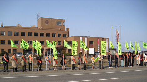 4. 浦河町職労の取り組み 浦河町職労では、役場課長会と共同で『春の全国交通安全運動』にあわせ、4月上旬(新入学児童への声かけも含めて)に街頭啓発運動を実施しています。 |