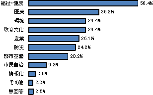 「市として最も力を入れるべき施策・課題は何か」について、10の選択肢から3つまで選んでもらった。「福祉・健康」56.4%、「医療」36.2%、「環境」29.4%、「教育文化」29.4%、「産業」26.1%、「防災」24.2%、「都市基盤」20.2%、そのほかの選択肢は10%未満となった。