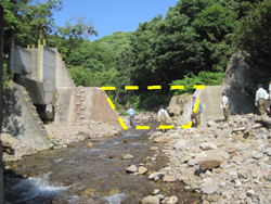 たまたま、この区間は道営の河川改修工事が下流から始まり、頭首工も改修が必要なことから欠陥魚道も併せて改修することとなっています。ただ昨今の予算削減により、実現が不透明な状況におかれ、改修計画の網掛けにより農業補助による改修工事も留め置かれて、抜本的対策が困難な状況になっています。 |