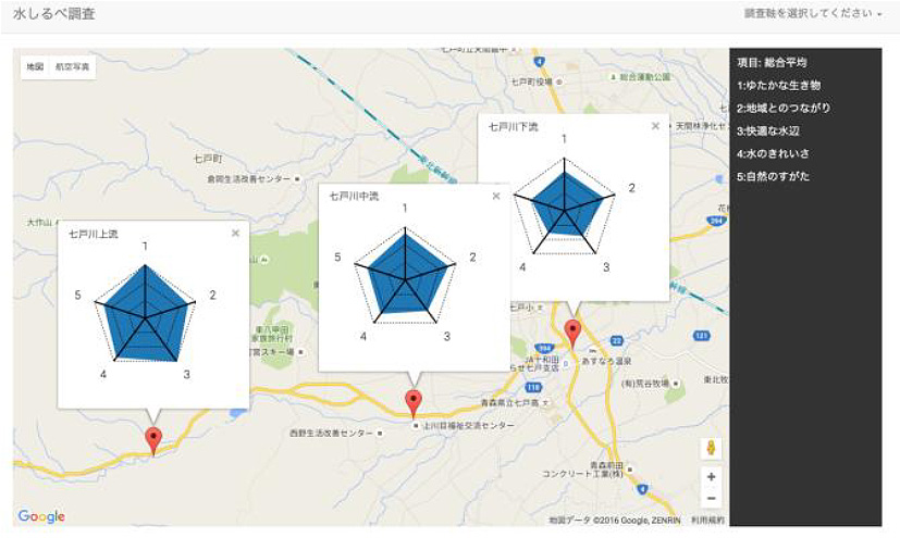 ここでは、天間東小学校4年生10人による2015年6月29日の調査例について述べる。当日、小川原湖自然楽校の相馬孝代表を講師に、地元の土地改良区事務所の職員が田んぼのあぜ道の草刈りをはじめとする支援活動の下、子どもたちは生き物調査を楽しんだ。子どもたちの身近には田んぼがあり、日常的に田んぼの風景を目にしているが、用水路での生き物との触れ合いがはじめての子どもも多く、希少種のトゲウオやナマズの子どもなどに興味津々として目を輝かしていたのが印象的であった。調査対象とした田んぼの所有者は、元土地改良区事務所の理事長を退任された方で、子どもたちと一緒になりながら、かつての"水ガキ"の時代を懐かしむとともにこの様な水環境を後世に残すことの大切さを子どもたちに伝えていた。また、天間東小学校では、長年に亘り田んぼの希少種・絶滅種調査を行っている。後日、かつて小学生の時に行った田んぼでの希少種・絶滅種調査が子ども連れで行われ、水環境保全の意識が世代間を通して継承されていることは心強い限りである。 今回の天間東小学校との共同研究のメインである七戸川の源流~中流~下流における水質生態系調査が2015年7月28日に5年生13人の参加で小川原湖自然楽校の相馬孝代表の指導の下に行われた。 今回、開発したインターネット対応のweb型マップアプリはGoogle Map上に調査地点毎に総合平均、自然なすがた、ゆたかな生き物、水のきれいさ、快適な水辺、地域とのつながりの6設問の結果をレーダーチャートで図示するものである。 このマップアプリの大きな特徴は、同一画面上に地理情報とデータや画像を可視化し、視覚的に把握できることである。 調査地点の緯度・経度を指定すると、調査地点毎にピンが表示され、航空写真と地図に切り替えることができる。 源流~中流~下流の総合平均(自然なすがた、ゆたかな生き物、水のきれいさ、快適な水辺、地域とのつながり)の得点が低くなることがわかる(写真7)。他の調査項目を選択すると、画面が切り替わり、下流になるにつれていずれの項目とも得点が低くなった。レーダーチャート図を非表示にし、土地利用をみると、源流は森林地帯、中流は水田と畑が広がる農村地帯、下流は七戸町市街地で、下流になるにつれて人間活動の影響を強く受けていることがわかる。 4. まとめ 地域の良好な水環境・生態系を保全・創造する上で、子どもたちが早くから水環境・生態系に親しむ、その仕組みを知り科学する心を育むことが重要である。このためには、かつて日本の夏にあふれていた"水ガキ達"を復活することが重要である。今回、小学校高学年を対象に、"水ガキ達"を卒業し、"水オヤジ達"となった市民や専門家の支援が極めて重要であること、子どもたちの水環境・生態系への理解と継続性を確保し、水環境教育を深化させるためにはITの活用が今後益々必要となることから研究者との連携が求められる。 |