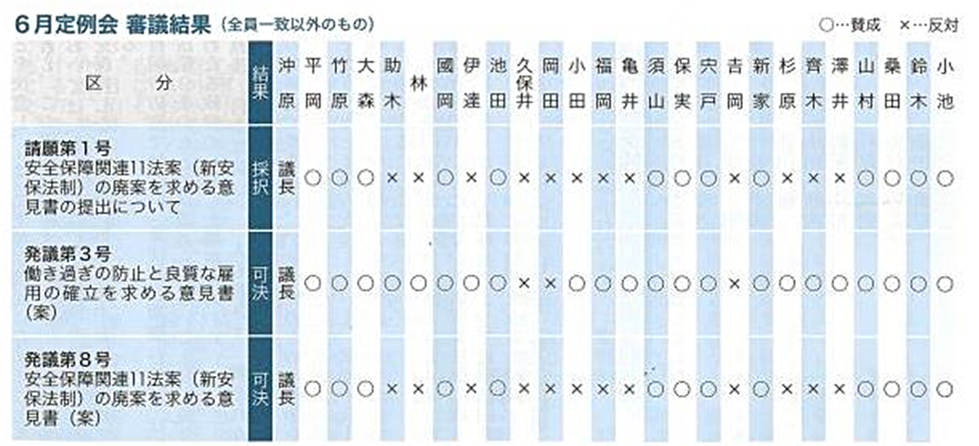 反対討論では、「軍備をもって抑止力とすべきである」「安全保障の隙間のない体制を構築すべき」「日本はアメリカの占領下から脱却しなければならない」など時代錯誤や軍備容認の憲法違反の発言がされ、市民が見守る中、戦争法11法案廃案に賛成する議員13人、反対する議員12人と1人差では有りましたが「廃案」を求める意見書は7月1日採択・可決となりました。