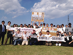 復興支援カフェなど、いろいろなコーナーが開催され、町民の方々には、西東京市民の制作した大豆雛と折紙をプレゼントして、お互いが楽しく時を過ごし、「絆」を深めました。2016年1月の「しんちまち生涯学習フェスティバル2016」まで、この交流は続いています。 |