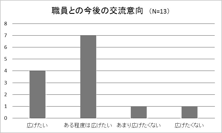 市職員に対して、「今後、協力隊員と交流することに関する考え」を問うたところ、30%が「非常に良いこと」と答え、67%が「良いこと」と答えている。 「あまり良いことでない」との回答は7人(3.5%)に過ぎず、職員は隊員との交流を肯定しているといえる。 |