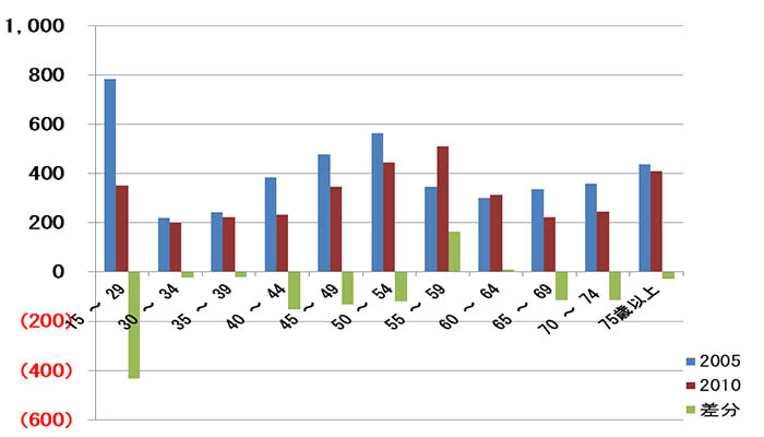 ③ 世代別農村人口の推移 30歳未満の減少と中心の年齢が50歳代になっているのが分かり、確実に高齢化が進んでいるのが分かります。 (2005→2010)農業センサスより