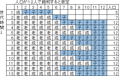 食糧、エネルギー、経済構造、社会構造、様々な要因によって、「日本列島ではこれ以上人口を増やすことができない」限界値が必ずあるはずです。実際の飽和人数は分からなくても、飽和状態になる数は必ずあります(条件①)。この時、親を殺してまで生きるという選択肢を除く(条件②)と、ある初期値(成人1人、子ども4人)では次のような人口推移となります。 ![]() 飽和状態があるという条件を課すだけで、子どもの数が激減(ピーク時の1/3)する世代が繰り返し現れます。子どもだけでなく、成人、老人も世代間で人数が安定しません。 また、初期値を成人1人で始めると次のようになります。 ![]() このケースでは、一度人口の飽和状態まで行き着いたにもかかわらず、次の世代では全体の人口までも1/3まで減少しています。 単純極まりないモデルですので、現実と大いに違いますが、定性的な部分で次の結論を得ます。それは「生物的には常に倍増する繁殖能力があっても、人口の飽和状態があると仮定するだけで、人口減少となる世代が現れる」と言う事です。この時、飽和状態の要因は問題になりません。経済的に安定し、子育て環境も完備され、生物的にも十分繁殖可能な条件がととのっていても、食料の量が限られているだけで人口の飽和状態が発生します。さらに言えば食料が十分に満たされても、エネルギーの供給限界を迎えると、やはり飽和状態が発生します。どんな状況であっても、必ず人口の飽和状態になるのです。そして、生物的な繁殖能力は十分あるにもかかわらず人口減少世代が生じるのです。 最後に、初期値を成人1人、子ども1人で始めると次のようになります。 ![]() 子ども、成人、老人の数が一定になったら、世代が進んでも人口構造が変わりません。ある種の「安定」を目標にするのであれば、各世代の人数が同値になれば良い、という事になります(人間の寿命を100歳とすると、0歳~33歳、34歳~66歳、67歳以上~に分けた時の人口が同じ値)。ただし、人口の飽和状態数が一定(あまり変化しない)である事が要件です。 |