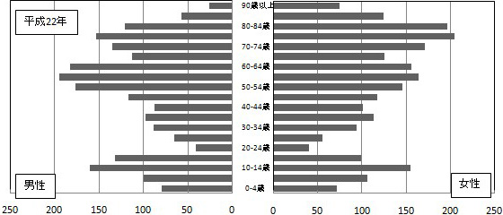 1960(昭和35)年と2010(平成22)年の人口ピラミッドをみると、ピラミッドの形が三角形からつぼ型に変化しています。国の人口ピラミッドでは団塊ジュニアによる40歳前後にも大きな膨らみがみられますが、本町においてはそれがみられません。 また、2010(平成22)年は20代の人口が極端に少なく、進学や就職で大部分が町外へ流出していると考えられます。今後、その世代が本町へ戻ってくる施策や魅力ある地域、子育て支援が必要であると考えられます。