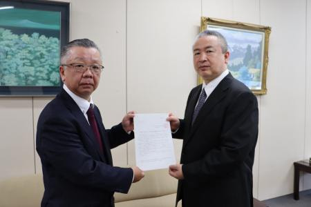 要請書を手交する総務省・出口自治財政局長(右)と伊藤書記長